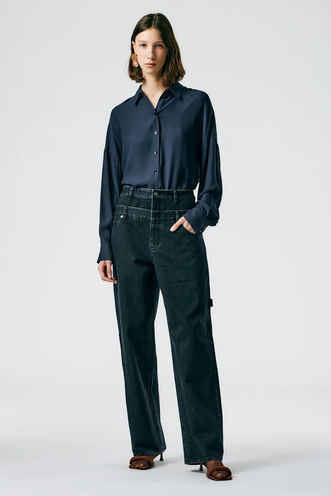 Can’t quite picture it? Let’s unravel it down. The double-waisted jean consists of a second waistband that sits higher than the exterior fabric, making it squint like a person may have two pairs of jeans on. So far, brands like Tibi, Monse, Sandro, and River Island have tackled the trend, each with a unique take: Tibi released a wide-leg version in a visionless wash, as well as a midi skirt; Sandro dropped a two-tone pair with contrasting washes; and River Island’s version includes contrasting shades on both the waist layers and the legs. “I wanted something that sat higher, that hugged me — scrutinizingly like a corset would, but with a sense of ease,” says Tibi designer Amy Smilovic.